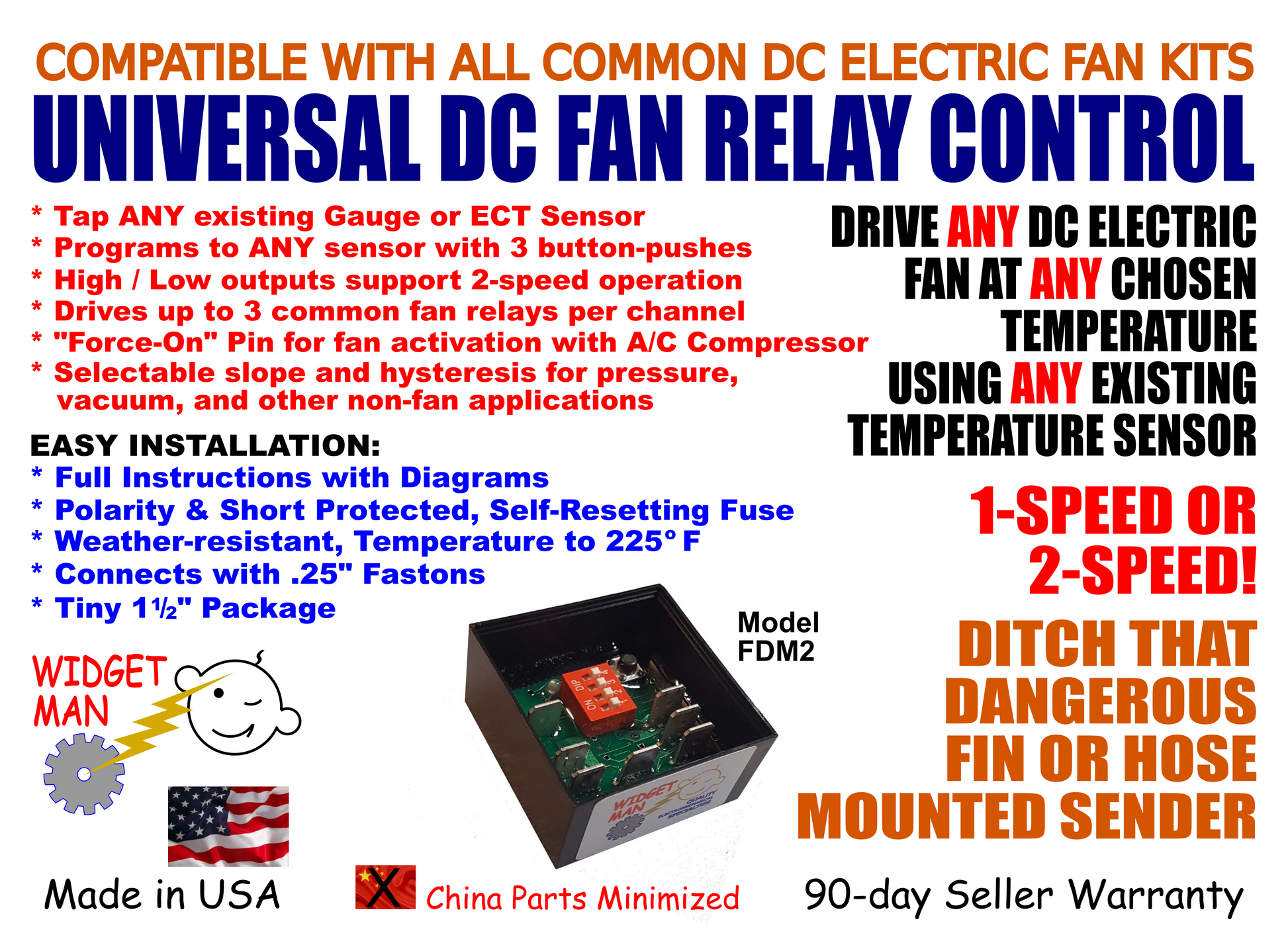 “Fin” and “inline” temperature senders can be just plain dangerous, letting a thermostat failure or coolant blockage disable your electric fan just when your engine needs it most. The FDM2 makes that a thing of the past, letting you use your existing temperature sensor to control the relays for your electric fan. Because it learns your sensor's voltage, you can also set the trip temperature for whatever your engine likes best, not a preset value that may clash with your thermostat temperature. It has two outputs and two memories to support either 1-speed or 2-speed operation, and selectable 2~16% hysteresis to prevent relay jitter and support non-temperature applications like electric brake booster pumps. There's also an override pin which can connect directly to most A/C clutches, to force the fan on whenever the compressor runs. It can drive as many as three standard “Bosch Box” relays per channel, and even has a 5V reference pin for powering DIY and 3-wire sensors. Like all WM products it's perfectly comfortable living in the engine box, and it's IP66 weatherproof if you seal the DIP switches with a dab of RTV. Keep your engine and fan on the same page, it's easy!